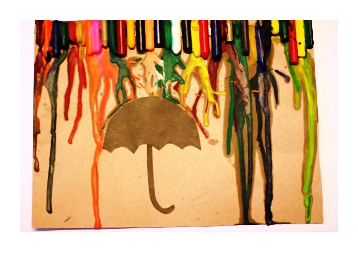 Tęczowy deszcz jest doskonałym pomysłem na wykorzystanie niepotrzebnych końcówek kredek woskowych. Pierwszy krok stanowi przymocowanie ich w wybranej kolejności do krawędzi dużej, sztywnej kartki. Najłatwiej dokonać tego za pomocą dwustronnej taśmy klejącej. Kolejny etap polega na wycięciu z samoprzylepnego papieru parasolki oraz kształtu zwierzęcia, które dziecko chce ochronić przed opadem np. jeża, królika czy ptaszka. Powstałe w ten sposób elementy przykleja się w okolicach dolnej części obrazu. Gdy wszystko jest gotowe, pozostaje wywołanie deszczu za pomocą ciepłego strumienia powietrza, skierowanego na kredki. Najlepiej sprawdzi się w tej sytuacji suszarka do włosów. Kiedy rysunek już wyschnie, wystarczy odkleić wycięte wcześniej kształty i w razie potrzeby, pozwolić dziecku na ich pokolorowanie.